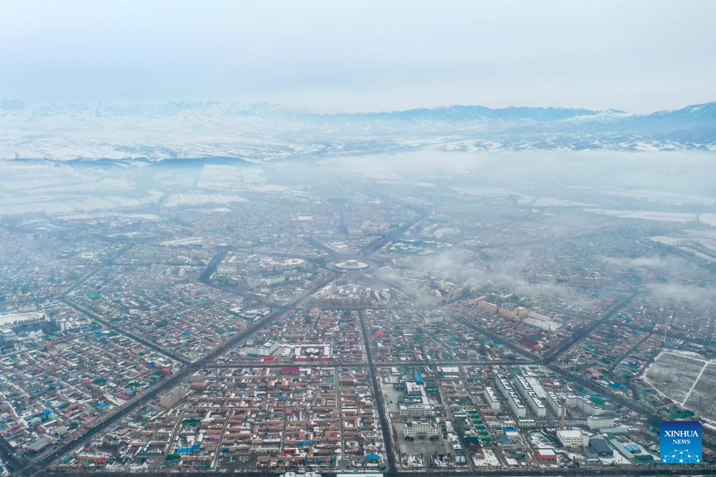 An aerial photo taken on Dec. 30, 2023 shows a view of Tekes County in Ili Kazak Autonomous Prefecture, northwest China's Xinjiang Uygur Autonomous Region.