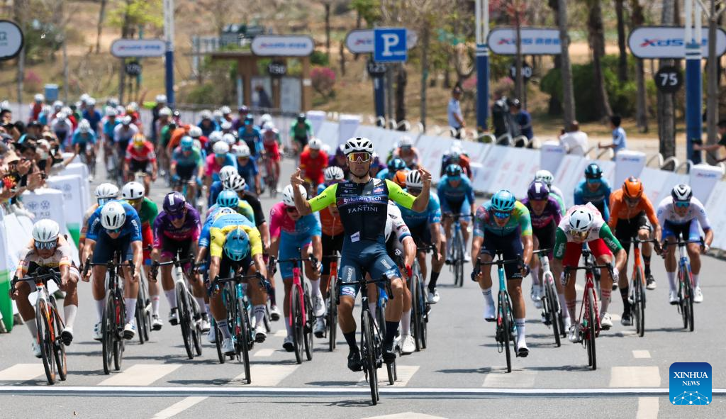 Dusan Rajovic (Front) of Solution Tech Vini Fantini celebrates winning Stage 2 at the 16th Tour of Hainan cycling race from Qionghai to Lingshui, south China's Hainan Province, April 8, 2025. (Xinhua/Yang Guanyu)