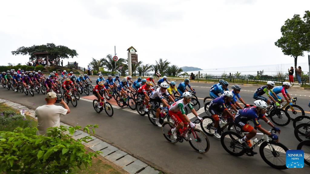 Cyclists compete during Stage 2 at the 16th Tour of Hainan cycling race from Qionghai to Lingshui, south China's Hainan Province, April 8, 2025. (Xinhua/Yang Guanyu)