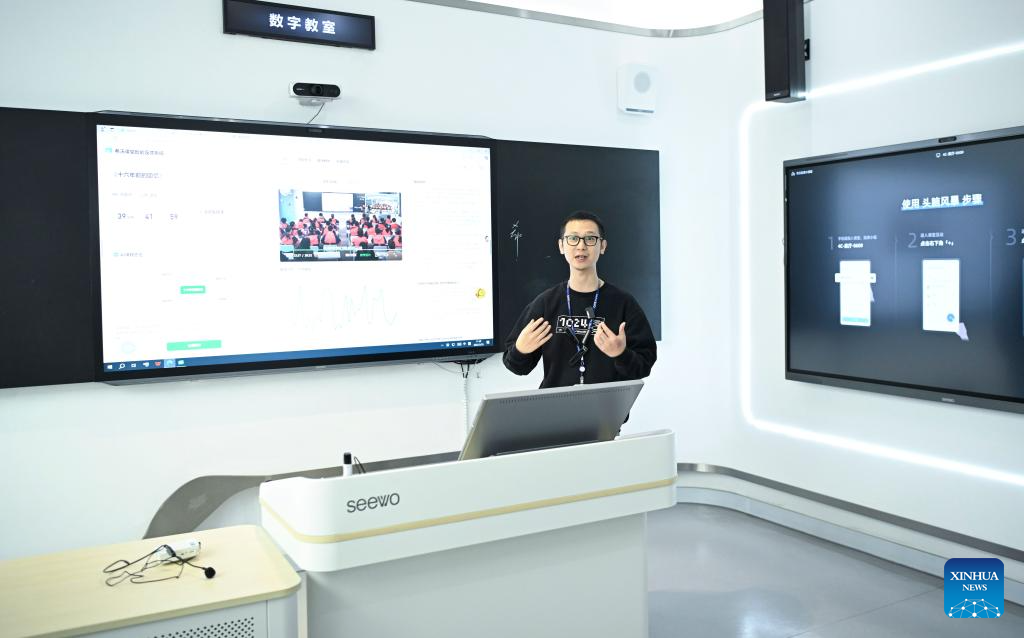 A staff member briefs on AI-powered teaching at Guangzhou Shiyuan Electronic Technology Company Limited in Guangzhou, south China's Guangdong Province, March 20, 2025. (Xinhua/Deng Hua)