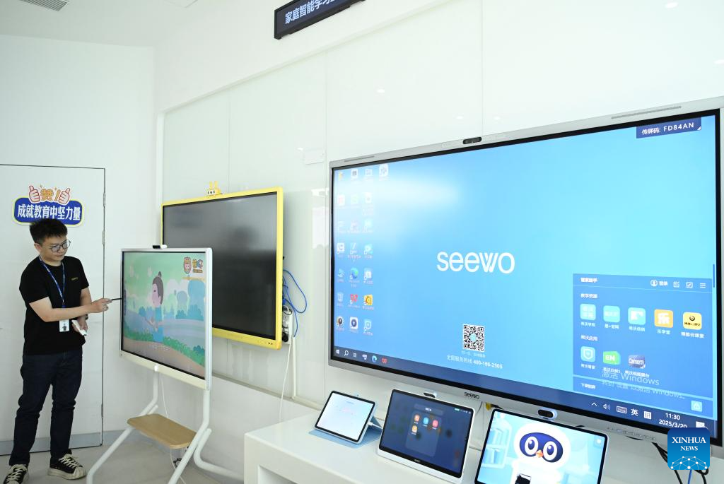 A staff member displays a smart educational system at Guangzhou Shiyuan Electronic Technology Company Limited in Guangzhou, south China's Guangdong Province, March 20, 2025. (Xinhua/Deng Hua)