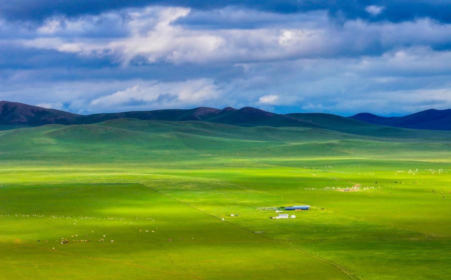 An aerial drone photo taken on July 16, 2024 shows the scenery of a grassland in West Ujimqin Banner of Xilin Gol League, north China's Inner Mongolia Autonomous Region. (Xinhua/Lian Zhen)