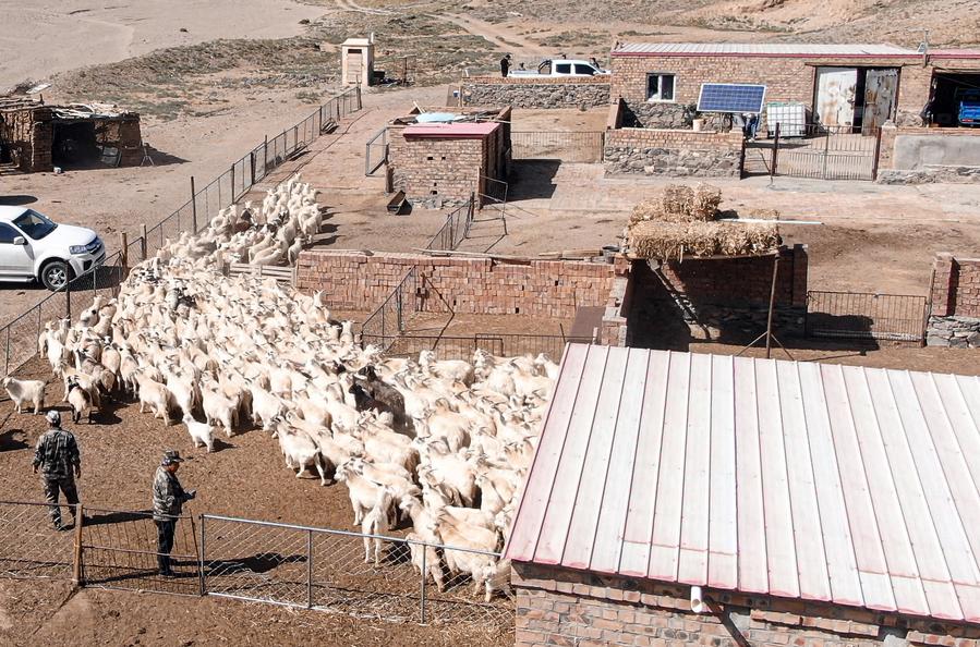 An aerial drone photo taken on April 2, 2024 shows sheep in a shed at the Urad Grassland in north China's Inner Mongolia Autonomous Region. (Xinhua/Li Yunping)