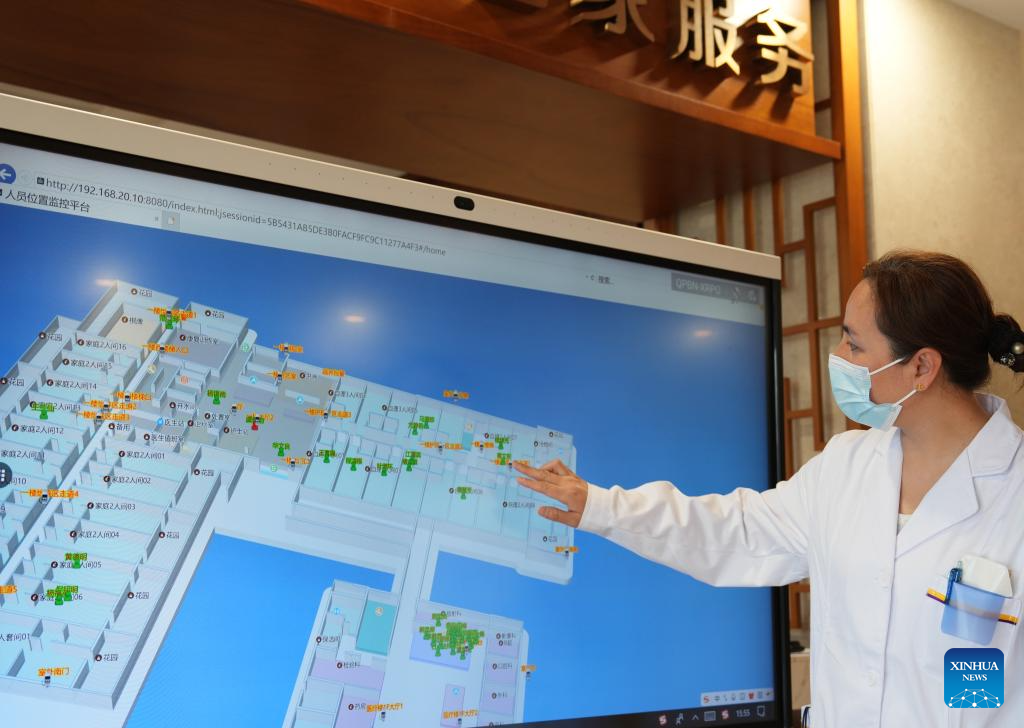 A staff member locates the particular positions of the elderly with a monitoring platform at a nursing home in Binghu District of Wuxi, east China's Jiangsu Province, April 8, 2025. (Xinhua/Liu Wenhui)