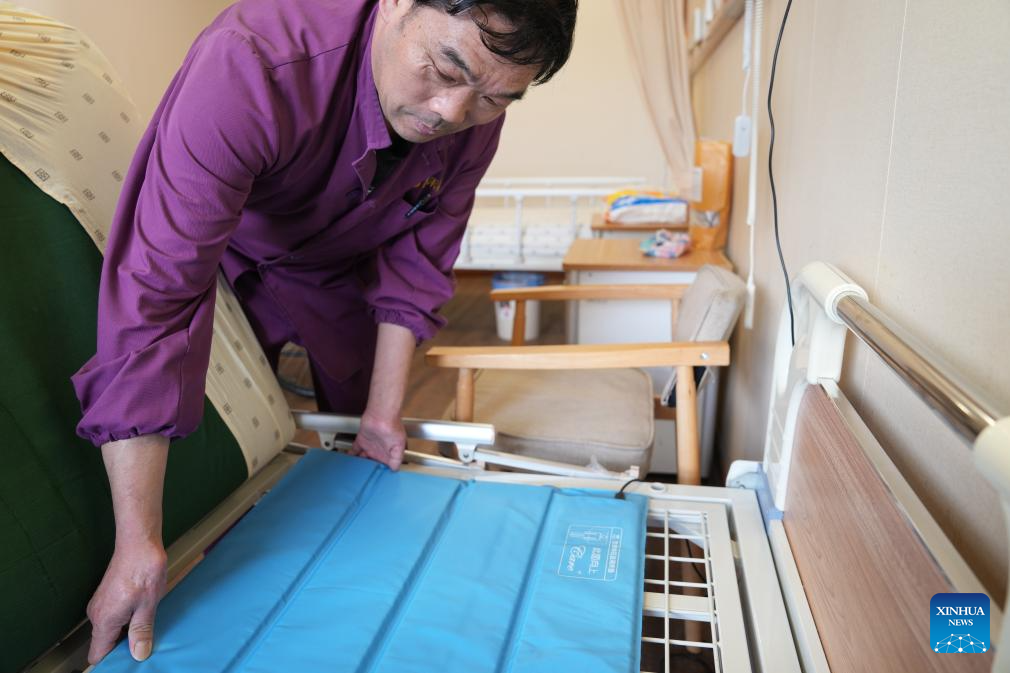 A staff member lays a vital signs monitoring mattresses, which can monitor the breathing and heart rate of the elderly and display data in real time, at a nursing home in Binghu District of Wuxi, east China's Jiangsu Province, April 8, 2025. (Xinhua/Liu Wenhui)
