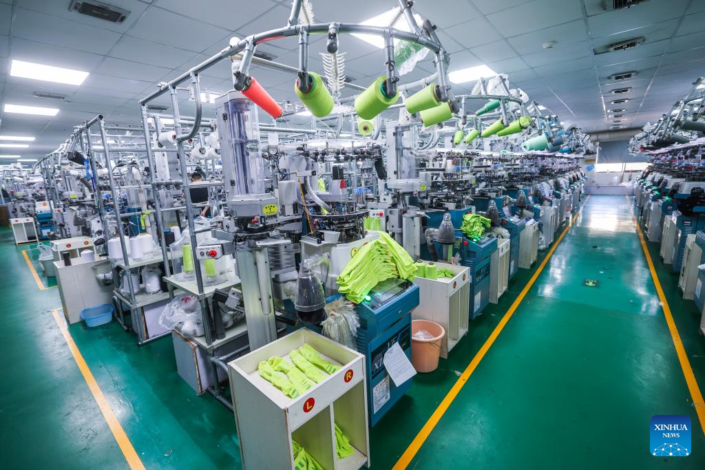 A worker is seen busy at the workshop of Baoge, a hosiery manufacturing enterprise, in Zhuji City, east China's Zhejiang Province on April 10, 2025. (Xinhua/Xu Yu)