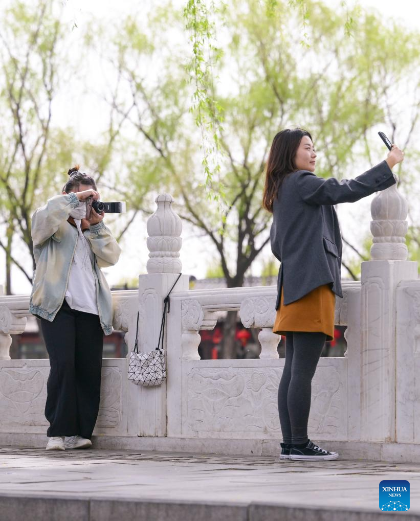 Visitors take photos beside a river in Beijing, capital of China, April 8, 2025.