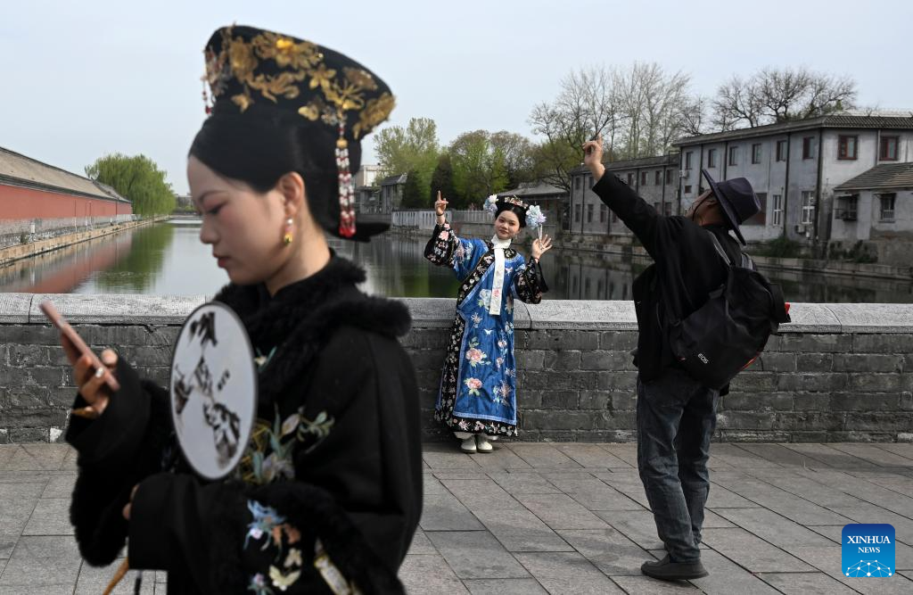 A photographer (L) takes photos of a tourist at Houhai scenic area in Beijing, capital of China, April 8, 2025.