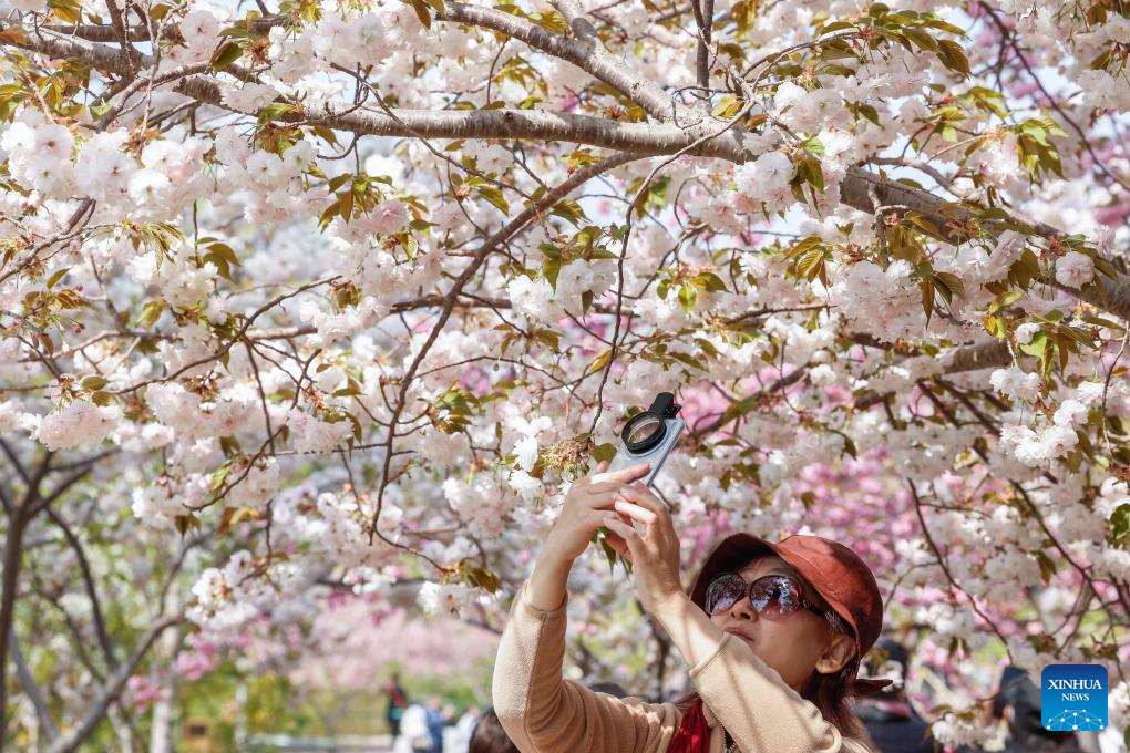 Visitors take photos of cherry blossoms at Yuyuantan Park in Beijing, capital of China, April 10, 2025.
