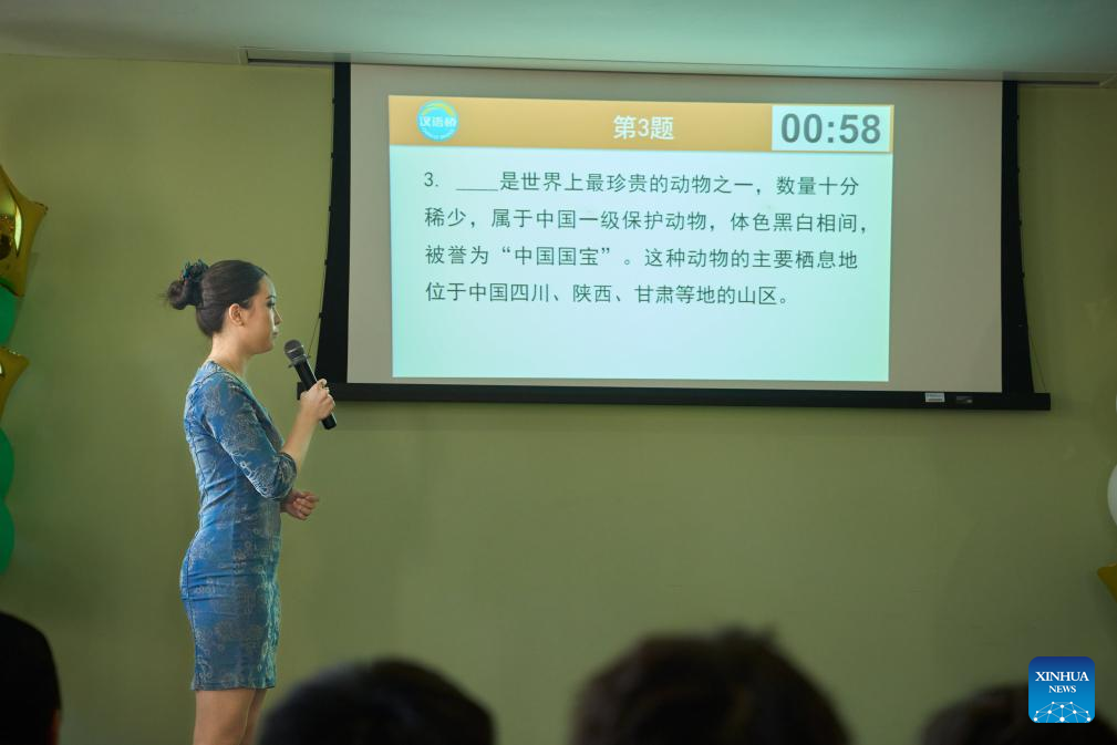 A contestant answers questions during the preliminary round of the 24th "Chinese Bridge" Chinese Proficiency Competition for Foreign College Students held in Vladivostok, Russia, on April 10, 2025. Covering various dimensions including Chinese history, geography, literature and arts, the competition featured three main sections: themed speeches, a quiz and impromptu speeches, and talent performances.