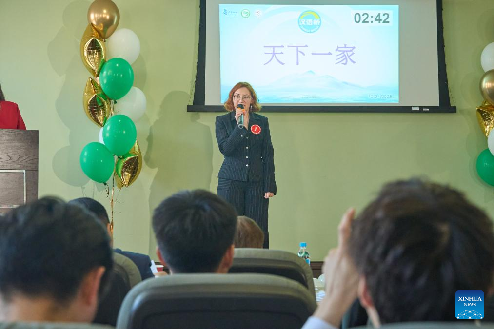 A contestant delivers a speech on the theme "One World, One Family" during the preliminary round of the 24th "Chinese Bridge" Chinese Proficiency Competition for Foreign College Students held in Vladivostok, Russia, on April 10, 2025. Covering various dimensions including Chinese history, geography, literature and arts, the competition featured three main sections: themed speeches, a quiz and impromptu speeches, and talent performances. The event was co-hosted by the Chinese Consulate General in Vladivostok and the Confucius Institute at Far Eastern Federal University. (Photo by Guo Feizhou/Xinhua)