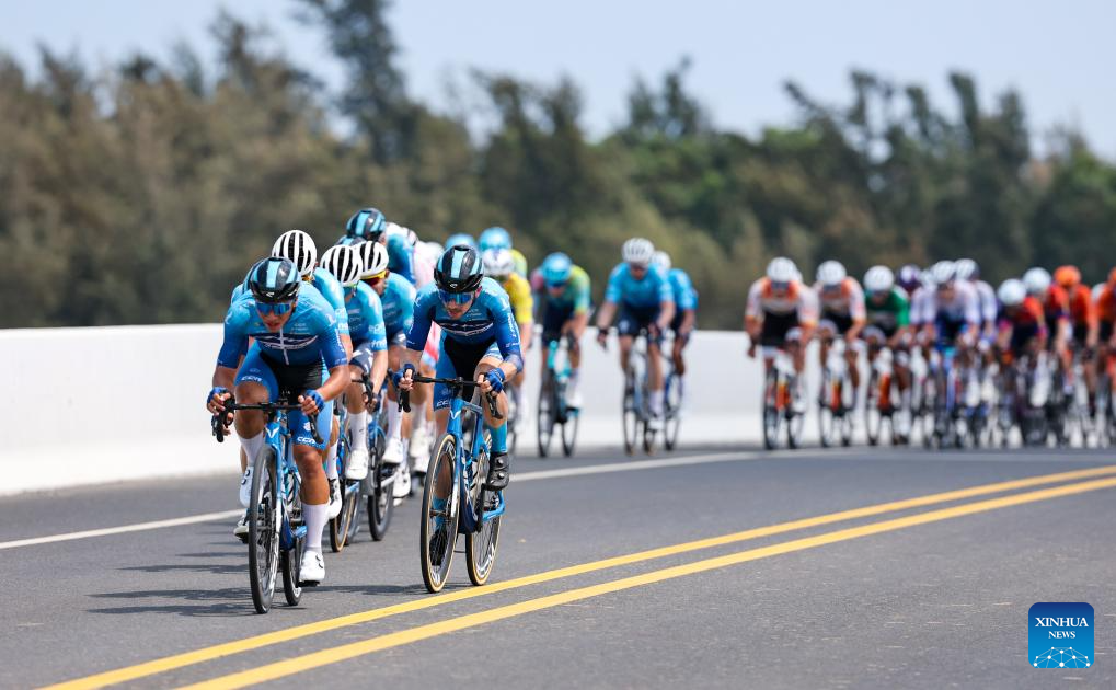 Cyclists compete during Stage 5 at the 16th Tour of Hainan cycling race from Dongfang to Sanya, south China's Hainan Province, April 11, 2025. (Xinhua/Yang Guanyu)