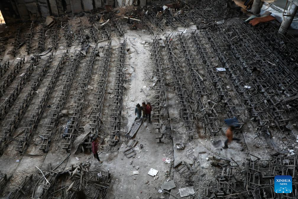 Displaced Palestinians are seen at the Islamic University of Gaza, which was damaged by Israeli bombardment, in Gaza City, April 11, 2025. The Islamic University of Gaza, one of the largest universities in the Gaza Strip, now has turned into a shelter for hundreds of Palestinian families. (Photo by Rizek Abdeljawad/Xinhua)
