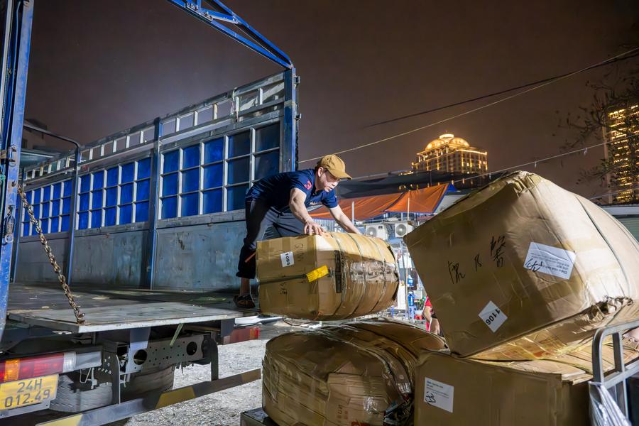 A vendor lifts flowers from China's Yunnan Province off a truck at Quang Ba Flower Market in Hanoi, Vietnam, March 28, 2025. (Xinhua/Zhu Wei)