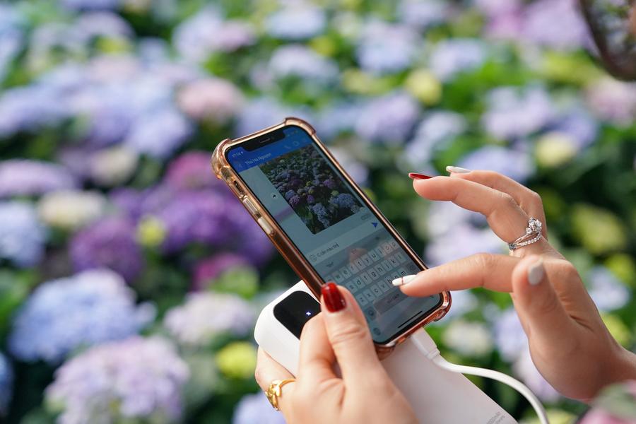 Vietnamese florist Nguyen Thuy Van takes pictures of flowers for customers at a flower base in Kunming, southwest China's Yunnan Province, April 11, 2025. (Xinhua/Chen Xinbo)