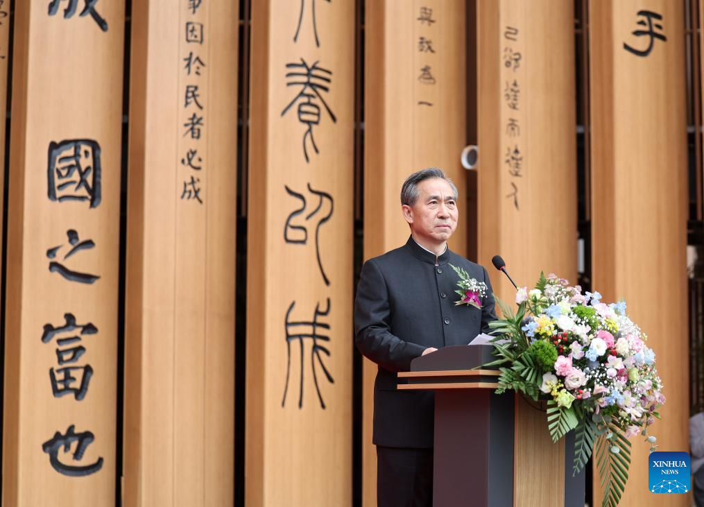 Ren Hongbin, chairman of the China Council for the Promotion of International Trade, addresses the opening ceremony of the China Pavilion at the Osaka Expo in Osaka, Japan, April 13, 2025. The China Pavilion officially opened on Sunday at the Osaka Expo, with an opening ceremony held in front of the pavilion's main building, which is designed to resemble a traditional Chinese scroll. Inspired by traditional Chinese calligraphy scrolls, the pavilion's architectural design embodies the theme of "Building a Community of Life for Man and Nature -- Future Society of Green Development." Osaka Expo 2025 will run from April 13 to October 13, 2025. The China Pavilion, one of the largest foreign self-built pavilions at the event, covers approximately 3,500 square meters. (Xinhua/Jia Haocheng)