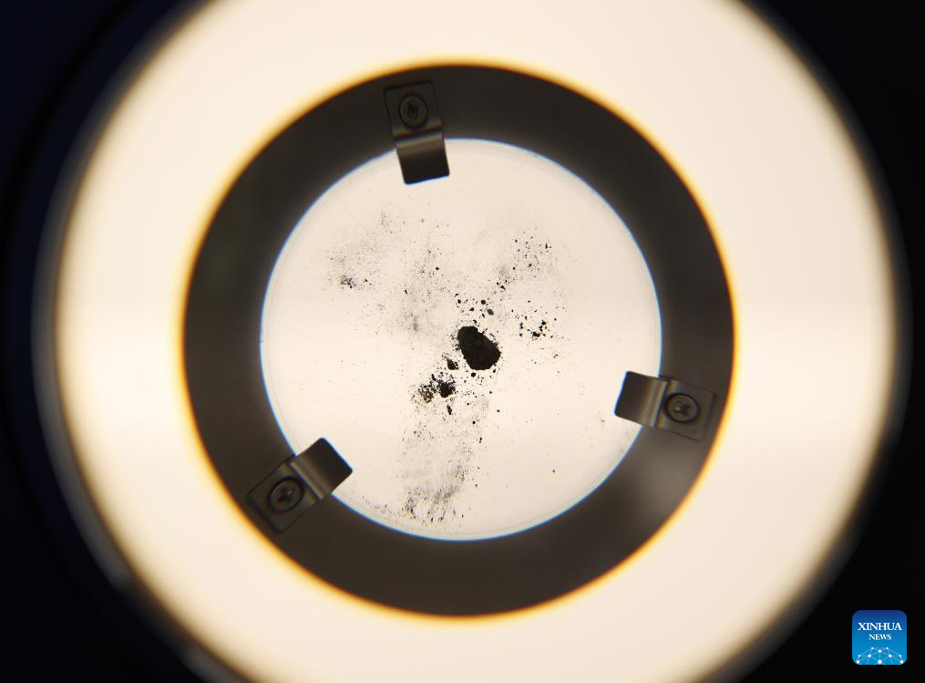 This photo taken on April 13, 2025 shows the lunar soil sample collected by China's Chang'e-5 mission displayed in the China Pavilion at the Osaka Expo in Osaka, Japan. The China Pavilion officially opened on Sunday at the Osaka Expo, with an opening ceremony held in front of the pavilion's main building, which is designed to resemble a traditional Chinese scroll. Inspired by traditional Chinese calligraphy scrolls, the pavilion's architectural design embodies the theme of "Building a Community of Life for Man and Nature -- Future Society of Green Development." Osaka Expo 2025 will run from April 13 to October 13, 2025. The China Pavilion, one of the largest foreign self-built pavilions at the event, covers approximately 3,500 square meters. (Xinhua/Jia Haocheng)