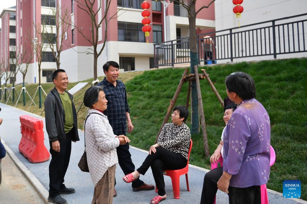 People chat at a resettlement site in Xingning Township, Zixing City, central China's Hunan Province, April 10, 2025. (Xinhua/Chen Zhenhai)