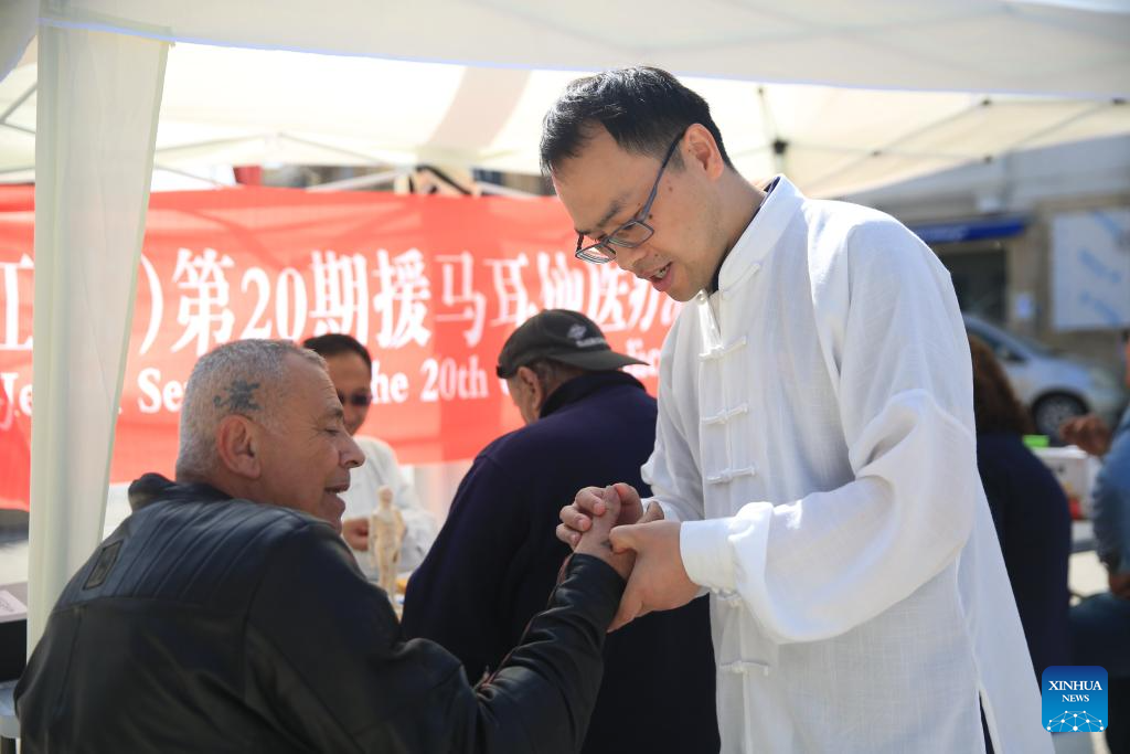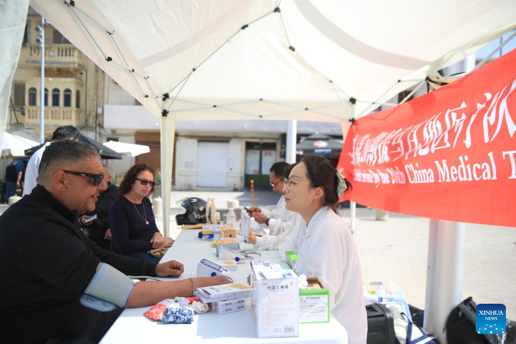 VALLETTA, April 13 (Xinhua) -- The 20th Chinese medical team for Malta from the Mediterranean Regional Centre for Traditional Chinese Medicine (MRCTCM) provided free clinical services to residents at the main square of Kalkara, southeastern Malta, on Sunday.