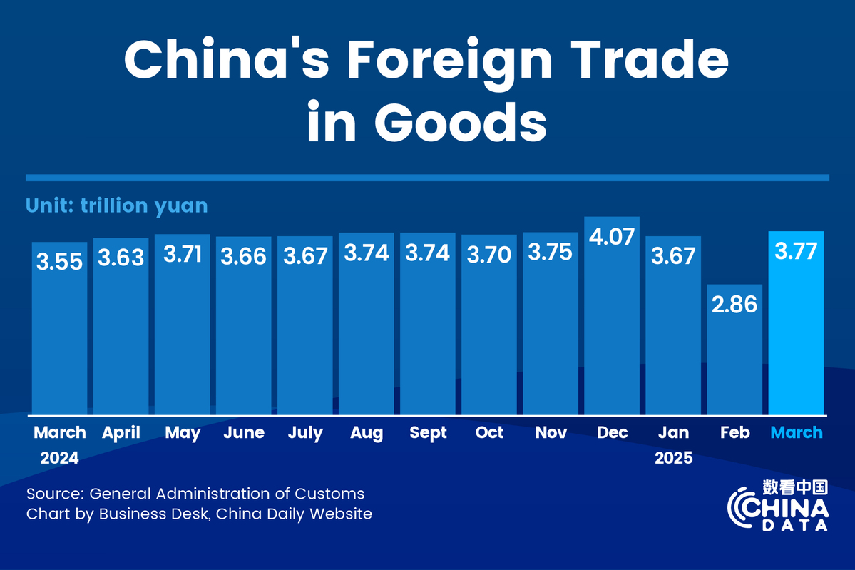 China's foreign trade recorded steady performances in the first quarter of 2025, with total goods trade volume growing by 1.3 percent year-on-year to 10.3 trillion yuan ($1.41 trillion), data from the General Administration of Customs showed on Monday.