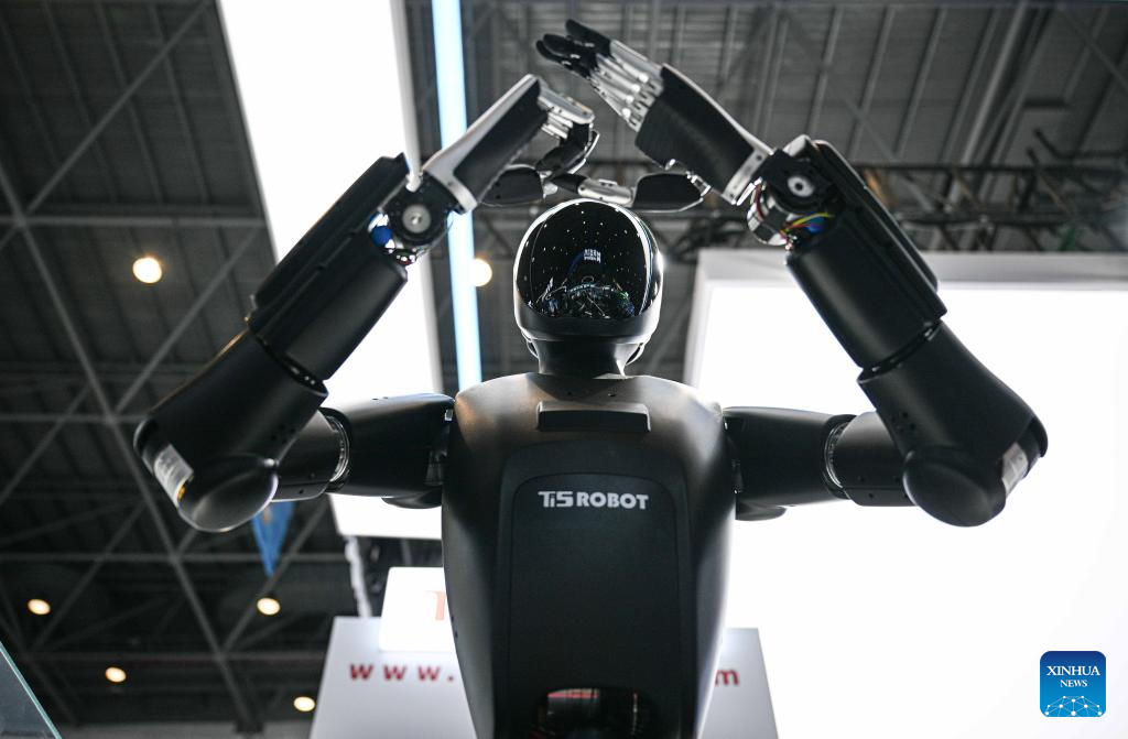 A robot performs traditional "fist and palm" salute at the 5th China International Consumer Products Expo (CICPE) in Haikou, south China's Hainan Province, April 14, 2025. This year's expo highlights future technology through the debut of various cutting-edge robots. By showcasing AI-powered functionalities and real-world applications, these robots offer a glimpse into the future of daily life. (Xinhua/Pu Xiaoxu)