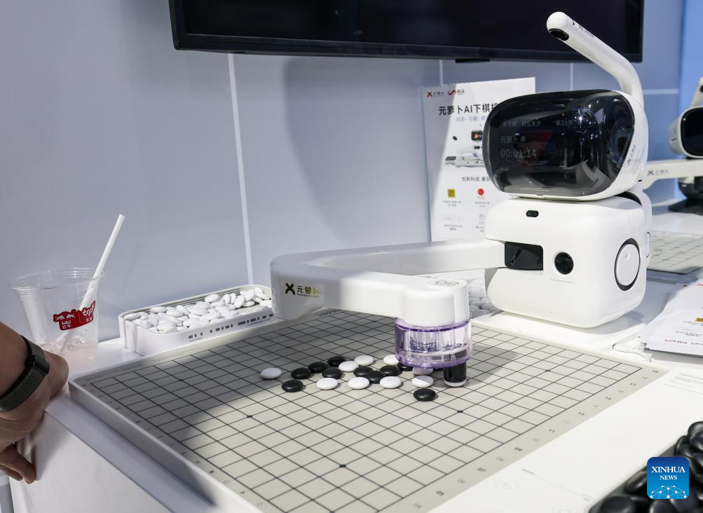 A robot plays gobang at the 5th China International Consumer Products Expo (CICPE) in Haikou, south China's Hainan Province, April 14, 2025. This year's expo highlights future technology through the debut of various cutting-edge robots. By showcasing AI-powered functionalities and real-world applications, these robots offer a glimpse into the future of daily life. (Xinhua/Yang Guanyu)