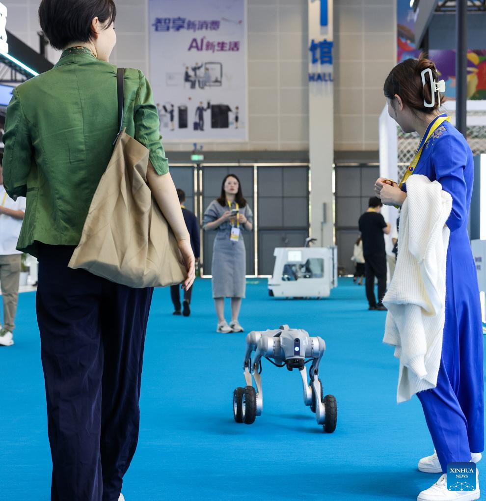A child interacts with a robot at the 5th China International Consumer Products Expo (CICPE) in Haikou, south China's Hainan Province, April 14, 2025. This year's expo highlights future technology through the debut of various cutting-edge robots. By showcasing AI-powered functionalities and real-world applications, these robots offer a glimpse into the future of daily life. (Xinhua/Yang Guanyu)