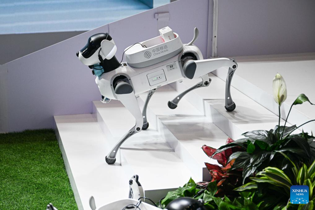 A robot dog carries medicines at the 5th China International Consumer Products Expo (CICPE) in Haikou, south China's Hainan Province, April 14, 2025. This year's expo highlights future technology through the debut of various cutting-edge robots. By showcasing AI-powered functionalities and real-world applications, these robots offer a glimpse into the future of daily life. (Xinhua/Pu Xiaoxu)