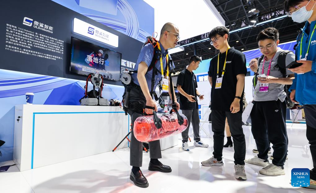 An exoskeleton robot by ULS Robotics is pictured at the 5th China International Consumer Products Expo (CICPE) in Haikou, south China's Hainan Province, April 14, 2025. This year's expo highlights future technology through the debut of various cutting-edge robots. By showcasing AI-powered functionalities and real-world applications, these robots offer a glimpse into the future of daily life. (Xinhua/Yang Guanyu)