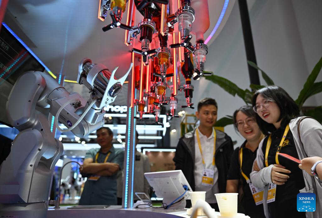 A robot performs cocktail mixing at the 5th China International Consumer Products Expo (CICPE) in Haikou, south China's Hainan Province, April 14, 2025. This year's expo highlights future technology through the debut of various cutting-edge robots. By showcasing AI-powered functionalities and real-world applications, these robots offer a glimpse into the future of daily life. (Xinhua/Guo Cheng)