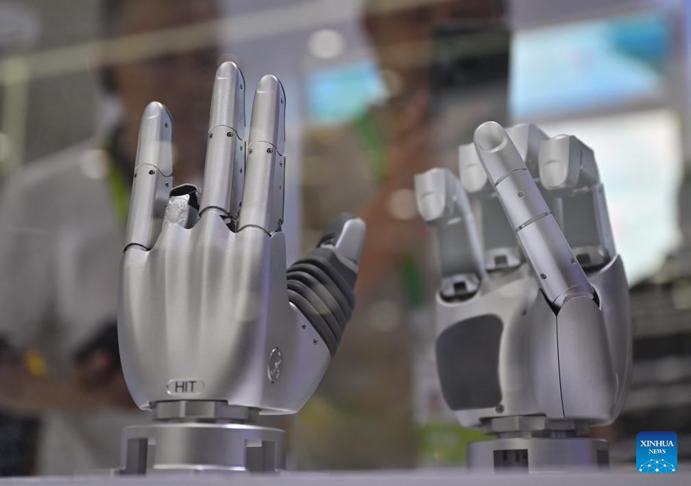 Robotic hands are pictured at the 5th China International Consumer Products Expo (CICPE) in Haikou, south China's Hainan Province, April 14, 2025. This year's expo highlights future technology through the debut of various cutting-edge robots. By showcasing AI-powered functionalities and real-world applications, these robots offer a glimpse into the future of daily life. (Xinhua/Guo Cheng)
