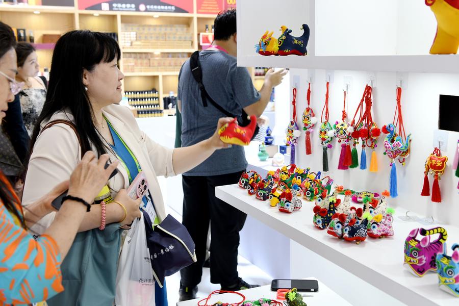People selects products of Lihou Tiger, a national intangible cultural heritage of north China's Shanxi Province, at the 5th China International Consumer Products Expo (CICPE) in Haikou, south China's Hainan Province, April 15, 2025. (Xinhua/Sun Xiaotian)