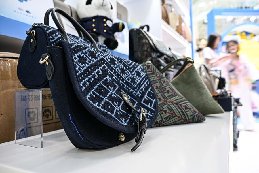 Li brocade handbags are pictured at the Hainan Pavilion at the 5th China International Consumer Products Expo (CICPE) in Haikou, south China's Hainan Province, April 15, 2025. (Xinhua/Pu Xiaoxu)