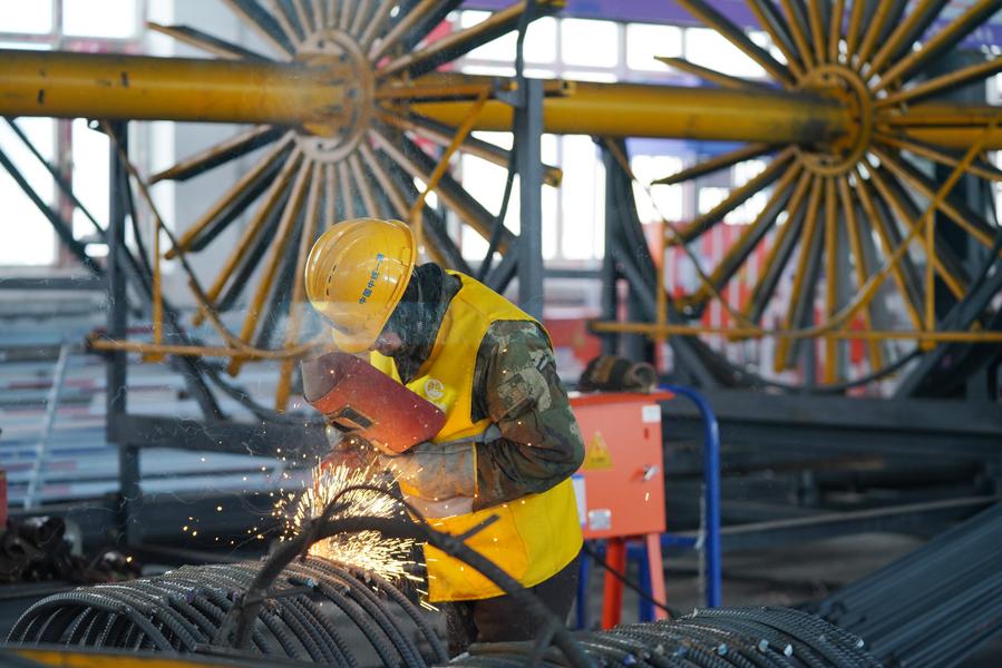 A worker conducts welding operation at a steel processing factory in northeast China's Heilongjiang Province, on March 29, 2025. (Xinhua/Wang Song)