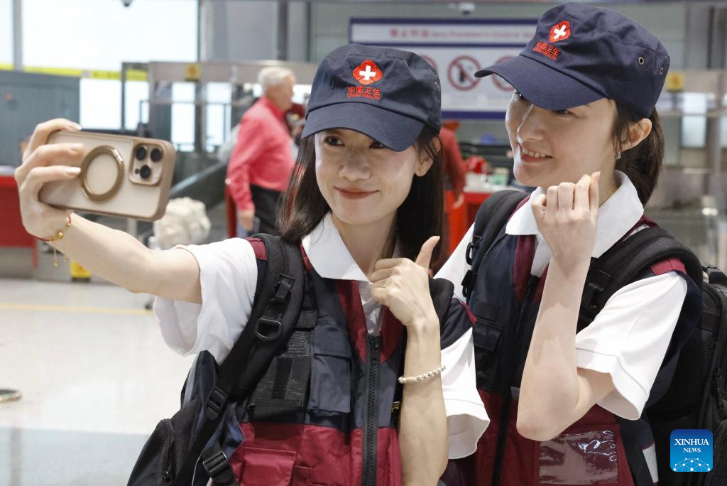 Members of a public health team to Myanmar are seen during a departure ceremony in Kunming, southwest China's Yunnan Province, April 19, 2025. A 50-member Chinese public health team departed for Myanmar on Saturday to support post-earthquake public health efforts there. The 7.9-magnitude earthquake, which jolted Myanmar on March 28, has claimed 3,726 lives and left 5,105 people injured, with 129 others remaining unaccounted for as of April 18, according to Myanmar's State Administration Council Information Team on April 19. (Xinhua/Chen Xinbo)
