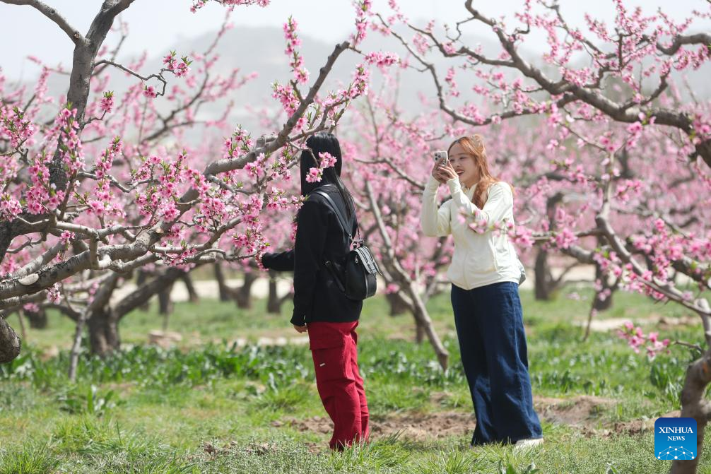 A tourist takes photos of peach blossoms in Lanzhou, northwest China's Gansu Province, April 19, 2025. (Xinhua/Lang Bingbing)