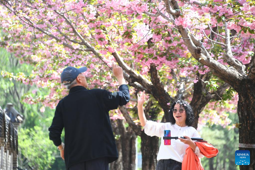 A citizen takes photos of cherry blossoms in Beijing, capital of China, April 19, 2025. (Xinhua/Ren Chao)