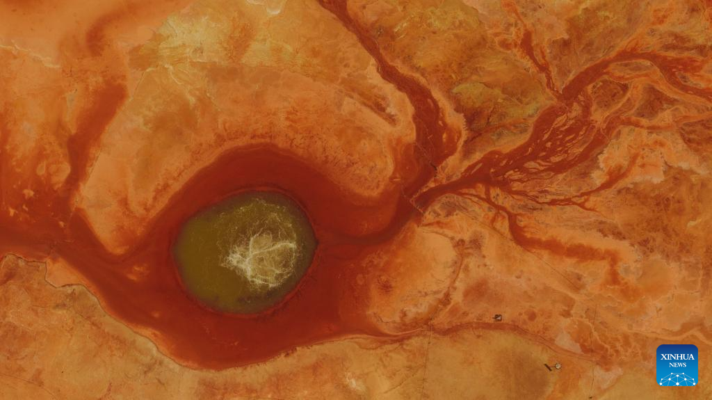 An aerial drone photo taken on April 19, 2025 shows the Aiken Spring in Mangya, Haixi Mongolian and Tibetan Autonomous Prefecture of northwest China's Qinghai Province. Located in northwest China's Qinghai Province, Aiken Spring is dubbed the "Eye of the Earth." This rare geological wonder forms a unique pupil shape from above, with spring water and surrounding deep red sediments resembling an eye embedded in the land. (Xinhua/Wang Bo)