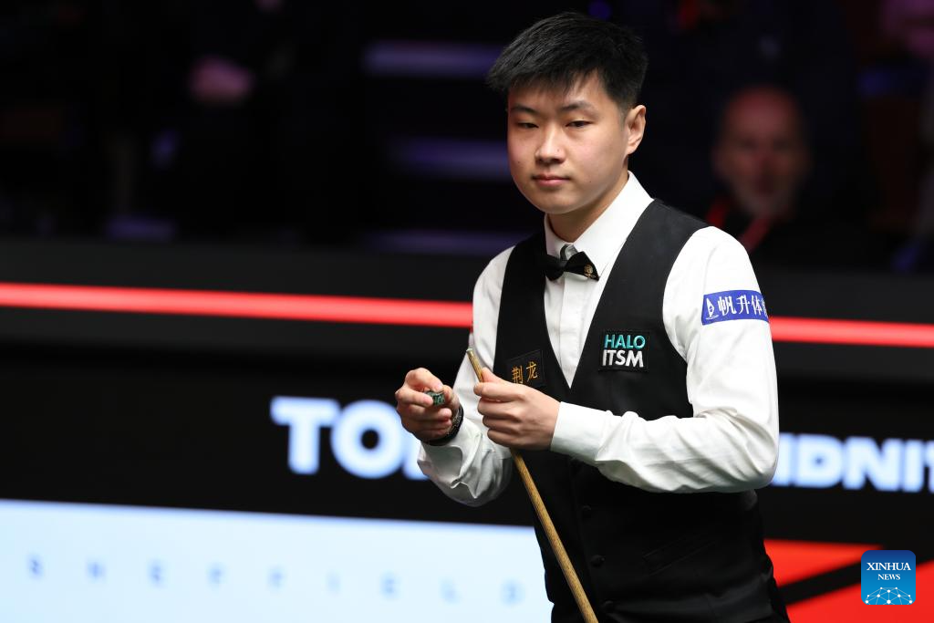 Zhao Xintong of China plays a shot during the round 1 match against Jak Jones of Wales at World Snooker Championship 2025 in Sheffield, Britain, April 21, 2025. (Photo by Zhai Zheng/Xinhua)