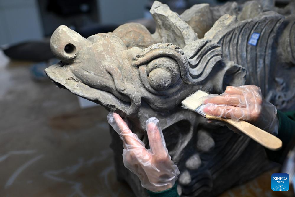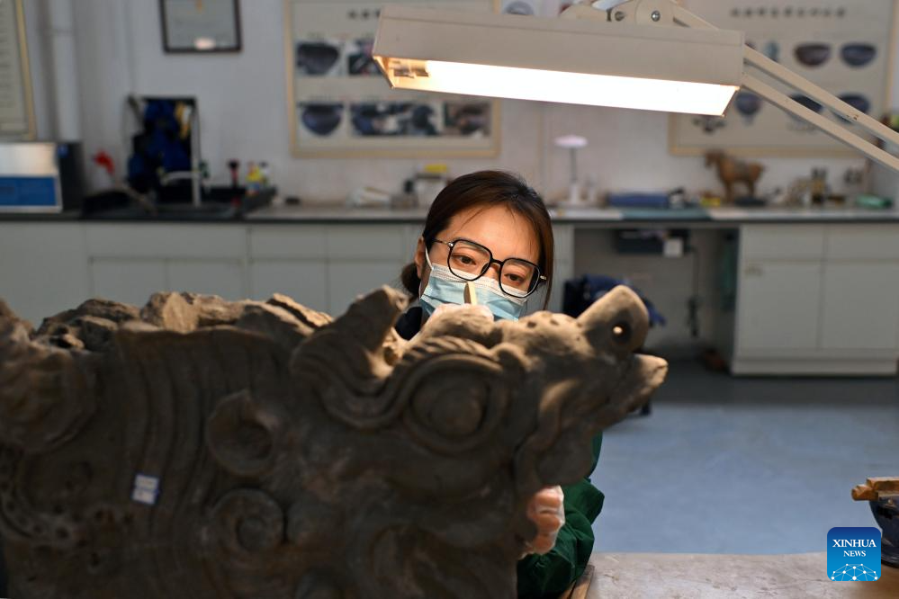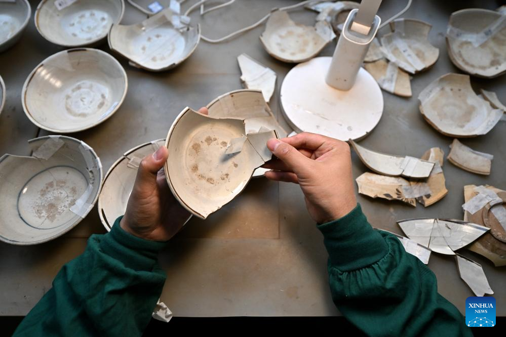 A staff member of the research institute of the Yungang Grottoes restores broken porcelain of the grottoes at the institute in Datong, north China's Shanxi Province, April 15, 2025. (Xinhua/Zhan Yan)