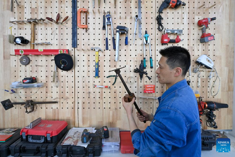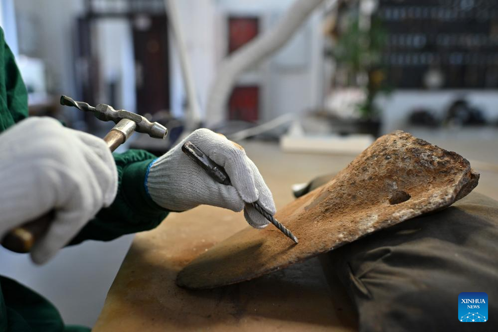 A staff member of the research institute of the Yungang Grottoes restores ironware of the grottoes at the institute in Datong, north China's Shanxi Province, April 15, 2025. (Xinhua/Zhan Yan)