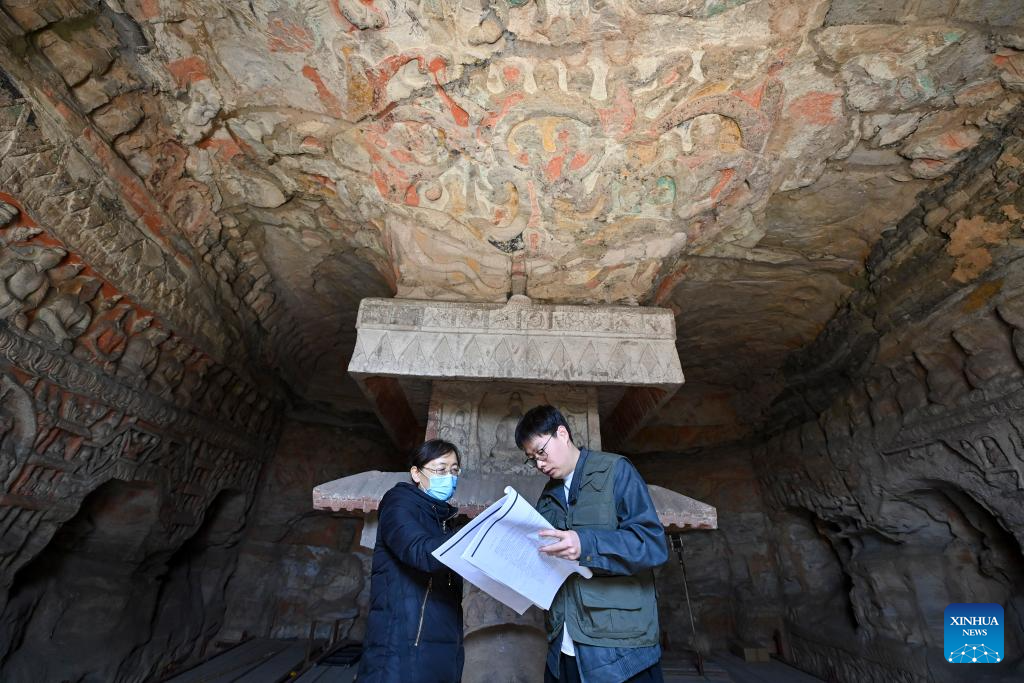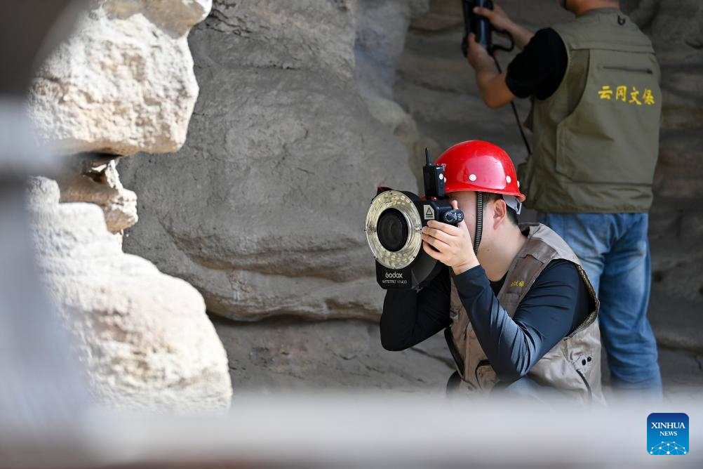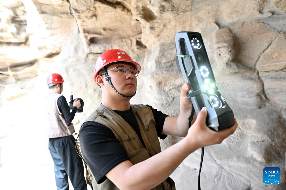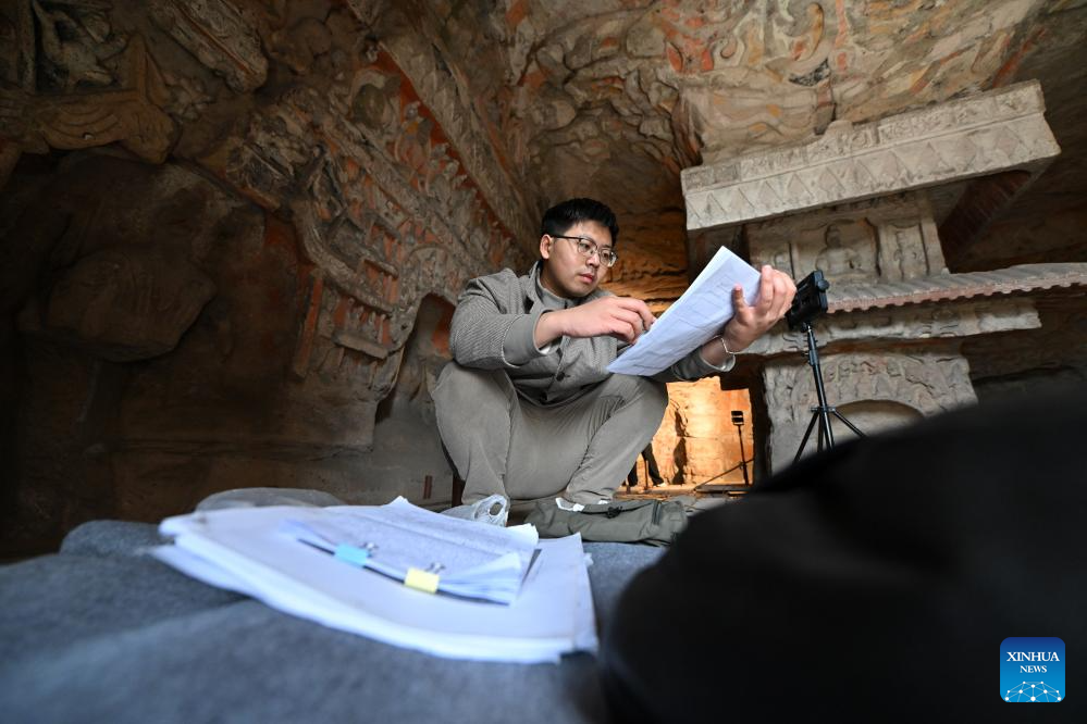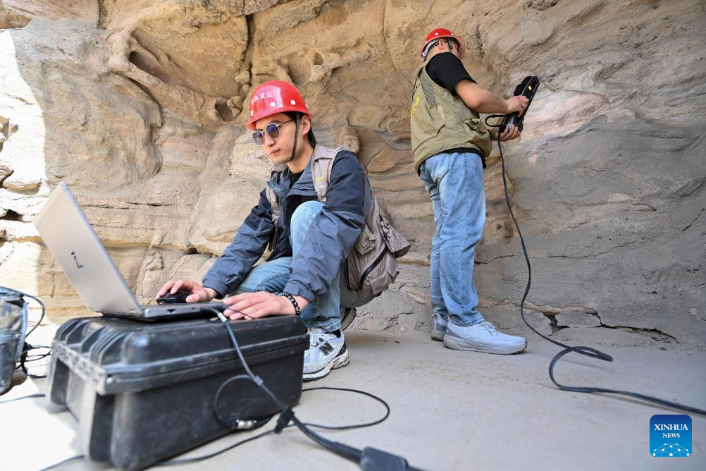 Pan Bo (R), a staff member of the research institute of the Yungang Grottoes, collects data at the grottoes in Datong, north China's Shanxi Province, April 16, 2025. (Xinhua/Zhan Yan)