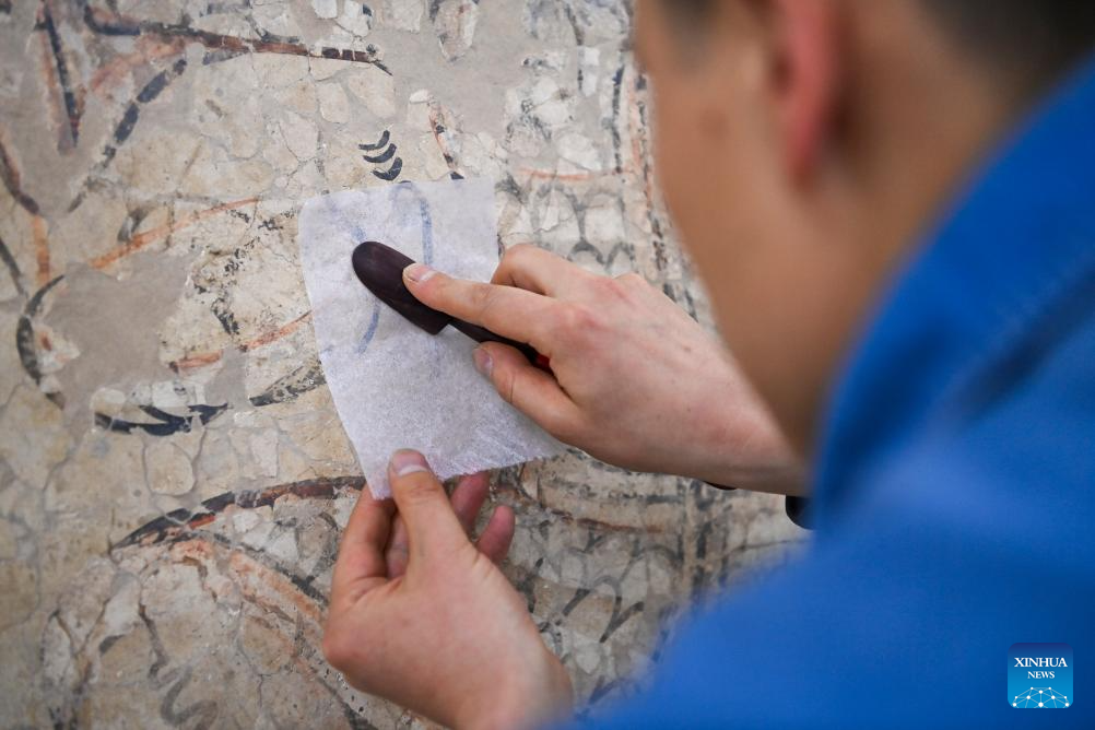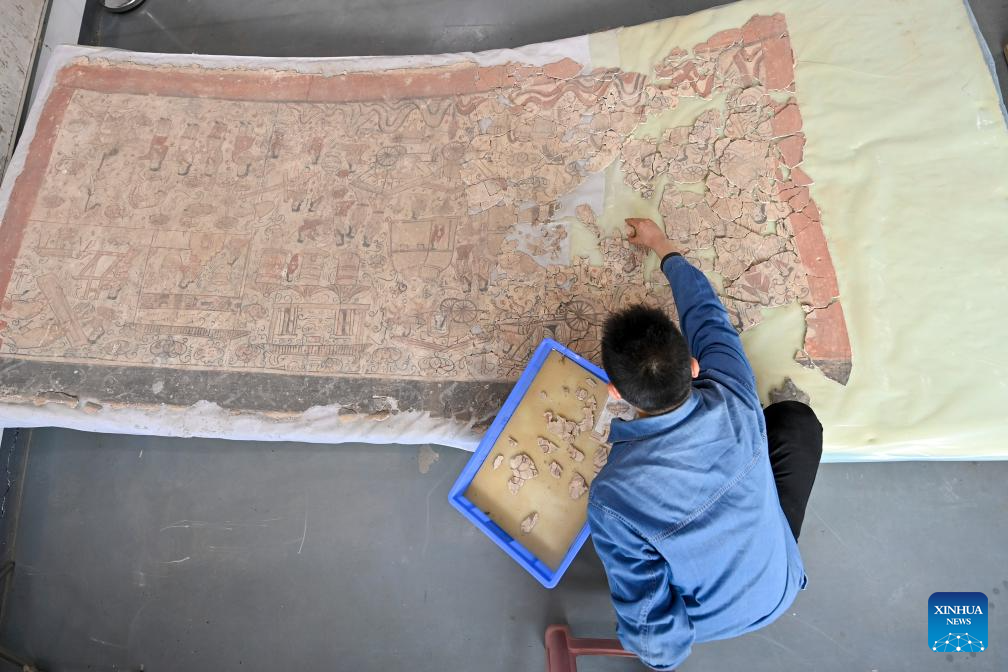Dai Yuxiang, a staff member of the research institute of the Yungang Grottoes, restores a mural of the grottoes at the institute in Datong, north China's Shanxi Province, April 15, 2025. (Xinhua/Yang Chenguang)