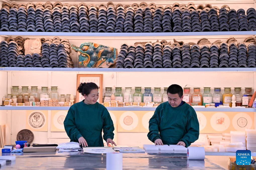 An Yongfang (L) and Wei Songlin, staff members of the research institute of the Yungang Grottoes, prepare for a study tour activity at the institute in Datong, north China's Shanxi Province, April 15, 2025. (Xinhua/Yang Chenguang)