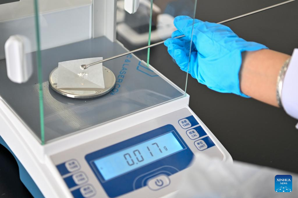 Zhang Fan, a staff member of the research institute of the Yungang Grottoes, weighs the sample of the grottoes wall at the institute in Datong, north China's Shanxi Province, April 16, 2025. (Xinhua/Yang Chenguang)