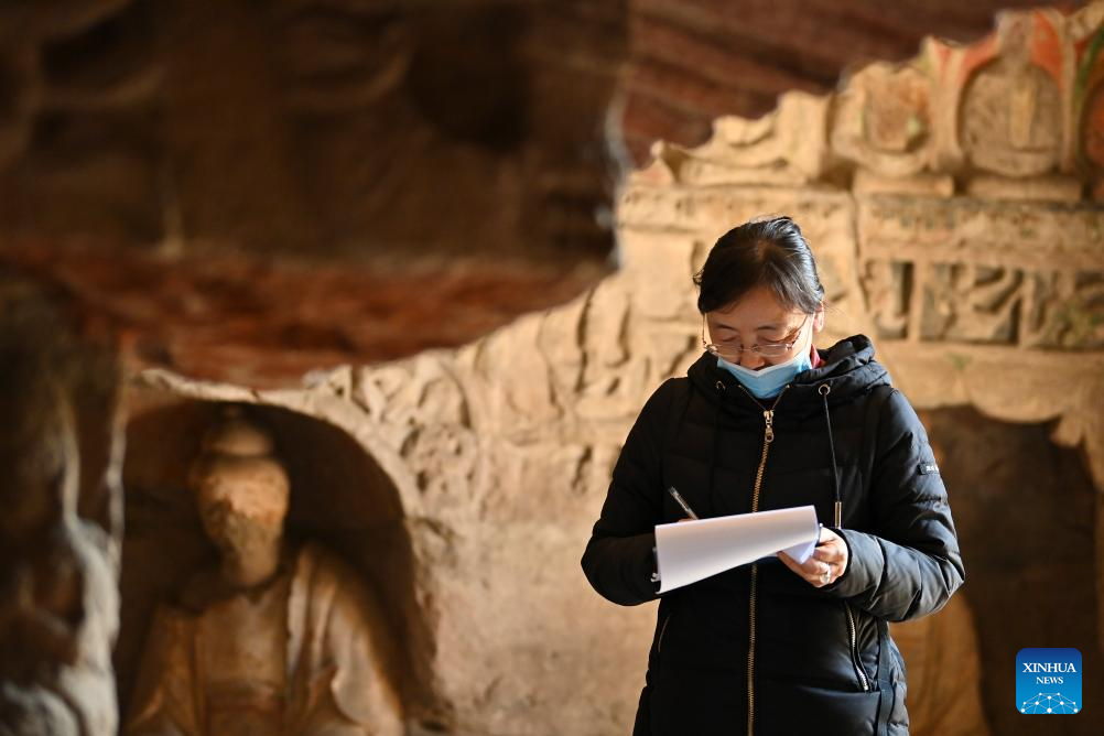 A staff member of the research institute of the Yungang Grottoes conducts an archaeological investigation at the grottoes in Datong, north China's Shanxi Province, April 16, 2025. (Xinhua/Zhan Yan)