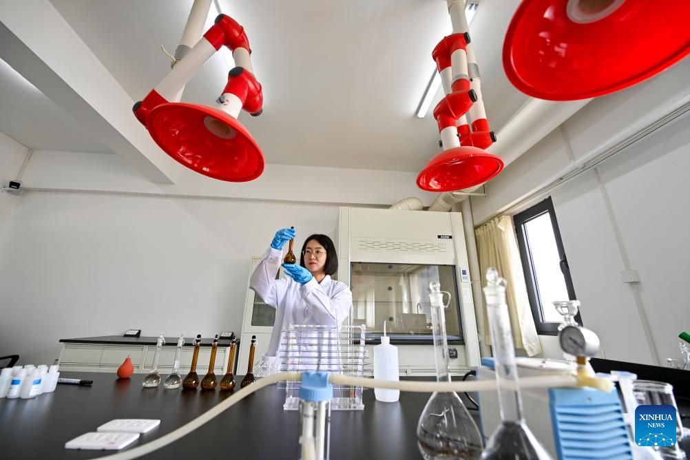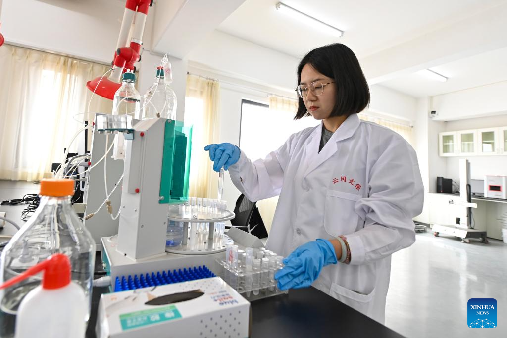 Zhang Fan, a staff member of the research institute of the Yungang Grottoes, dissolves the sample of the grottoes wall at the institute in Datong, north China's Shanxi Province, April 16, 2025. (Xinhua/Yang Chenguang)