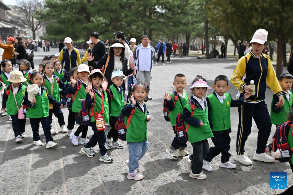 Children visit Yungang Grottoes under the guidance of their teachers in Datong, north China's Shanxi Province, April 16, 2025. (Xinhua/Zhan Yan)