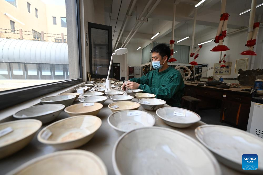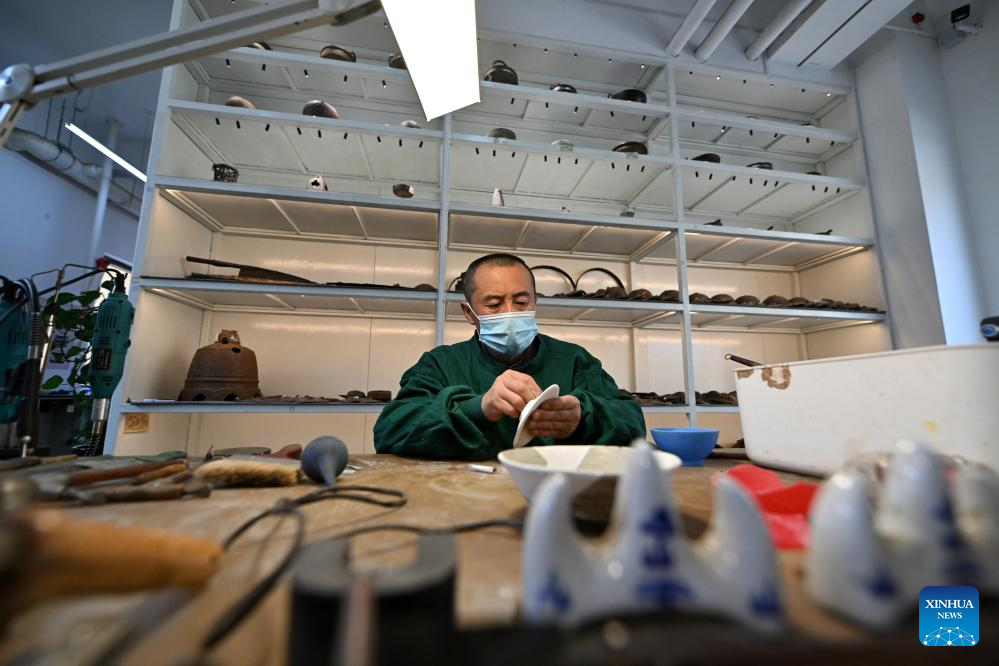 Li Pengfei, a staff member of the research institute of the Yungang Grottoes, restores porcelain of the grottoes at the institute in Datong, north China's Shanxi Province, April 15, 2025. (Xinhua/Zhan Yan)
