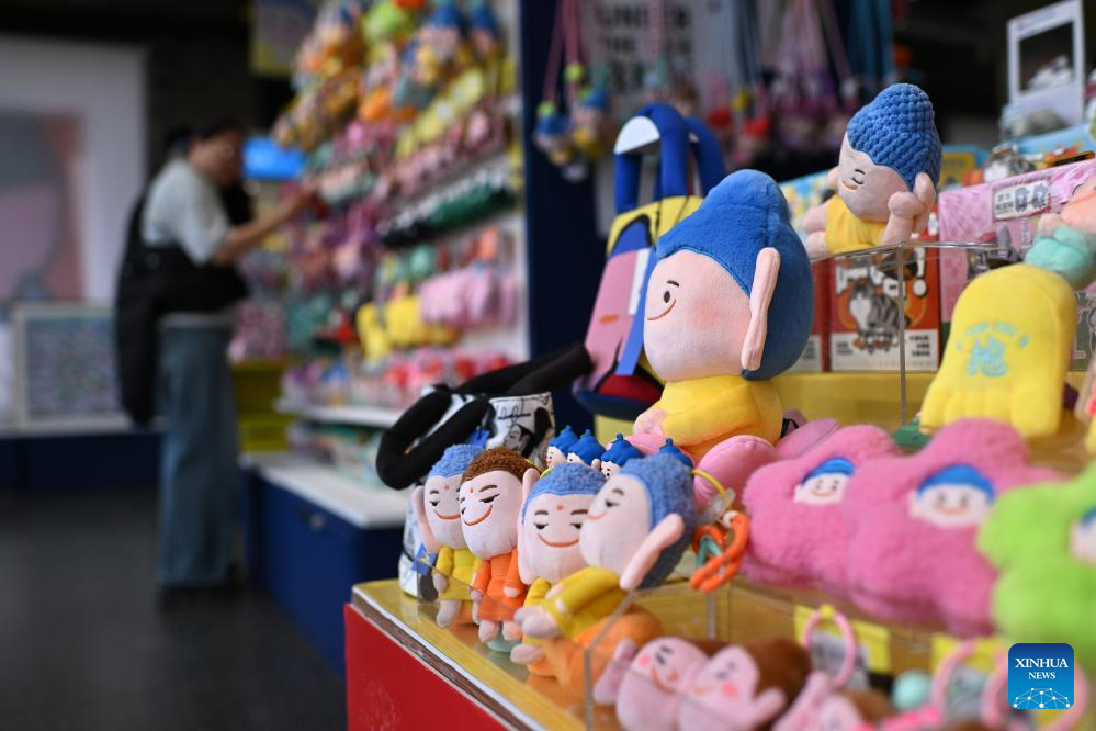 A tourist selects cultural and creative products at a shop near Yungang Grottoes in Datong, north China's Shanxi Province, April 16, 2025. (Xinhua/Zhan Yan)
